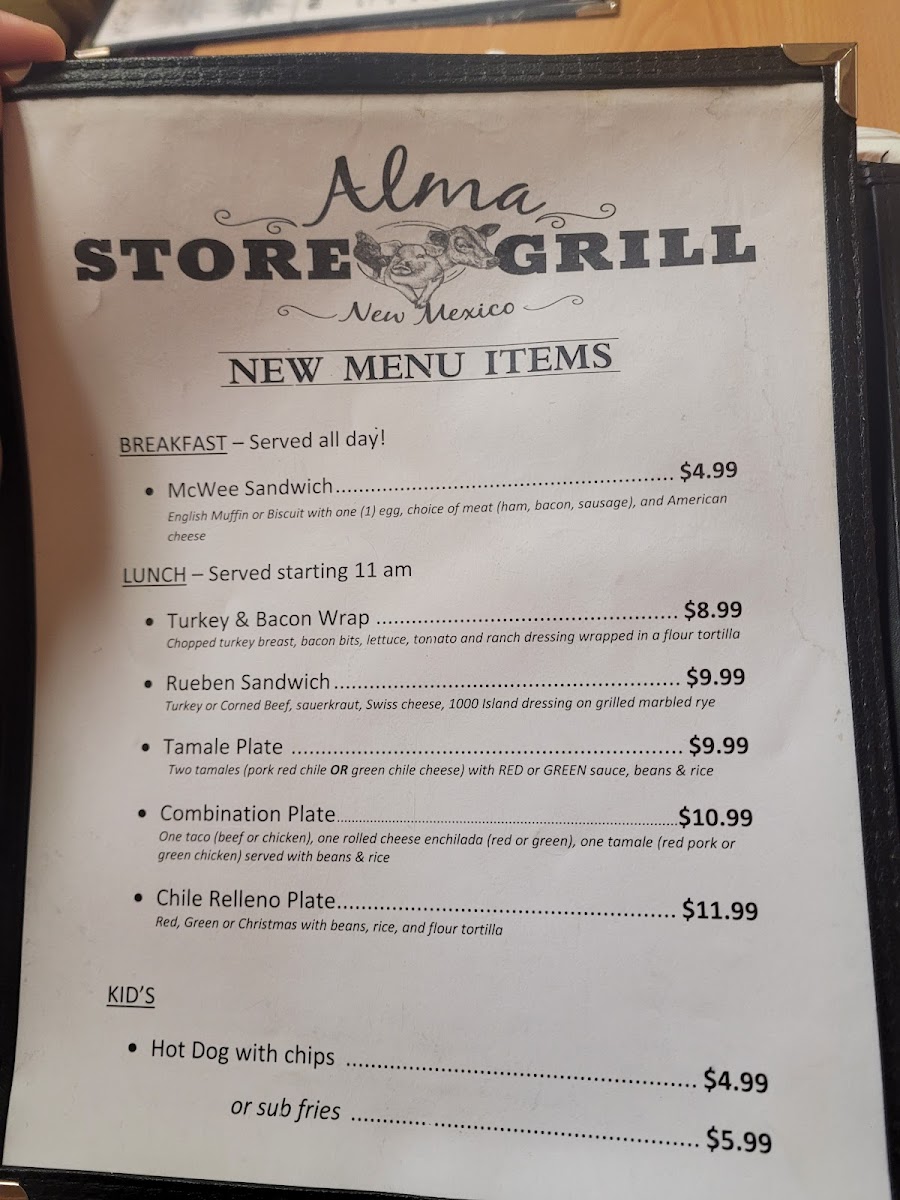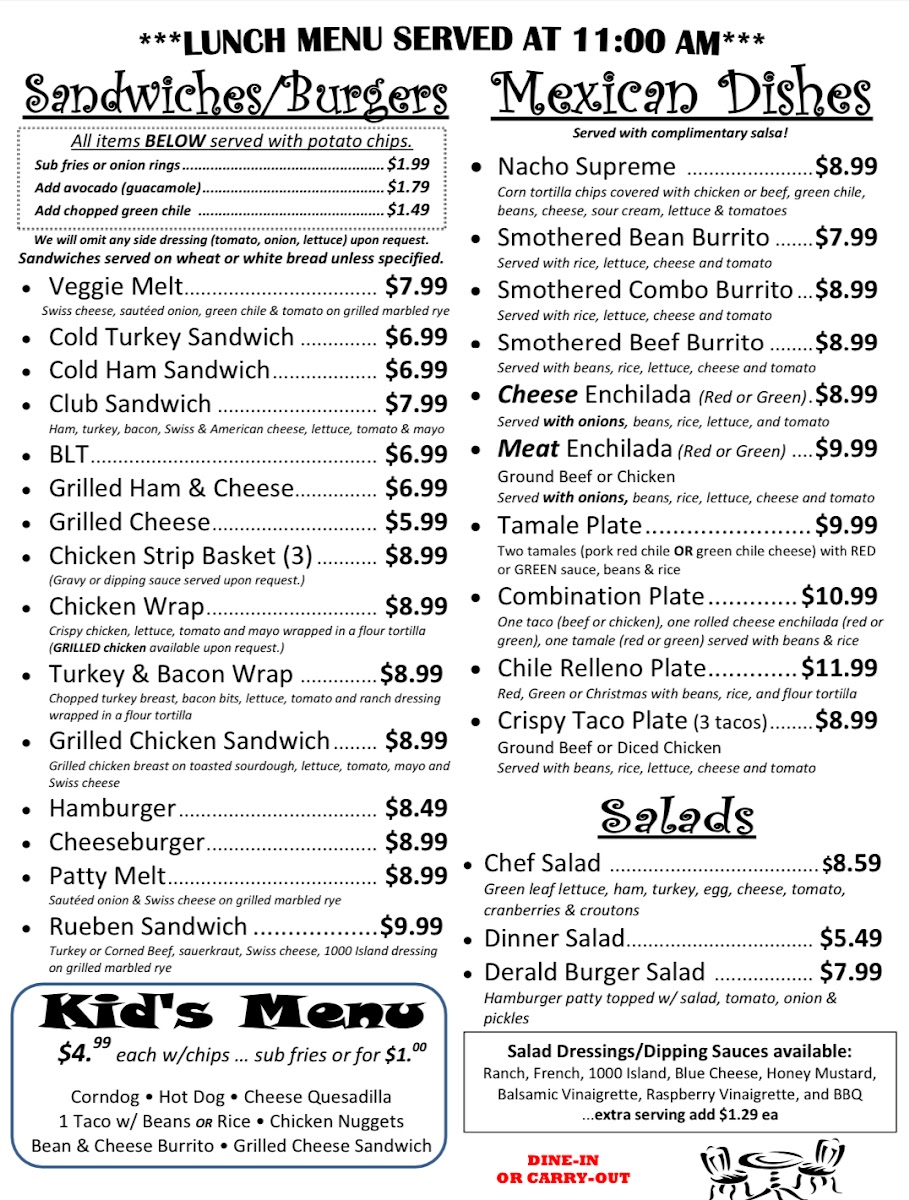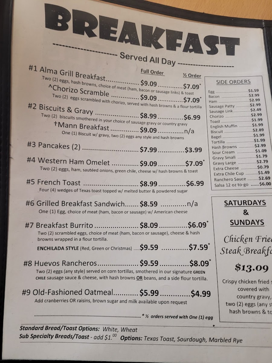 Welcome to Alma Grill, a hidden gem nestled in Glenwood, NM. This charming restaurant offers a menu rich with diverse options, ensuring something for everyone. Begin your meal with mouthwatering salads like the Chef Salad or the hearty Derald Burger Salad, both perfect for a refreshing start. For side orders, indulge in classics such as crispy bacon or flavorful chorizo, priced affordably between US$1.59 to US$2.99.